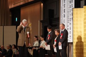 藍綬褒章を受賞された鞍谷秀郎先生に花束とお祝いの踊り、歌が披露されました。