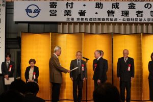 京遊連社会福祉基金白川理事長より助成金を受領する上野 修左京区保護司会会長